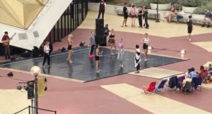 It was about four o’clock in the afternoon on July 26th when the SNB dancers took the stage at the venue on the beach to start blocking the choreography. It began to drizzle. We did our best, stopping periodically to let the tech crew wipe the stage. The drizzle continued on and off and seemed to subside during the dancers’ warm-up on stage. But as the dancers went to the dressing rooms to don their costumes, the wind came up and blew over the tent that was to be used for quick changes, and the rain came pouring down. We all waited tensely. The dancers could not perform on a wet stage, as it is too dangerous. I wondered what to do. I looked out into the audience thinking that people would leave. To my utter amazement, nobody left. In fact, more people came.